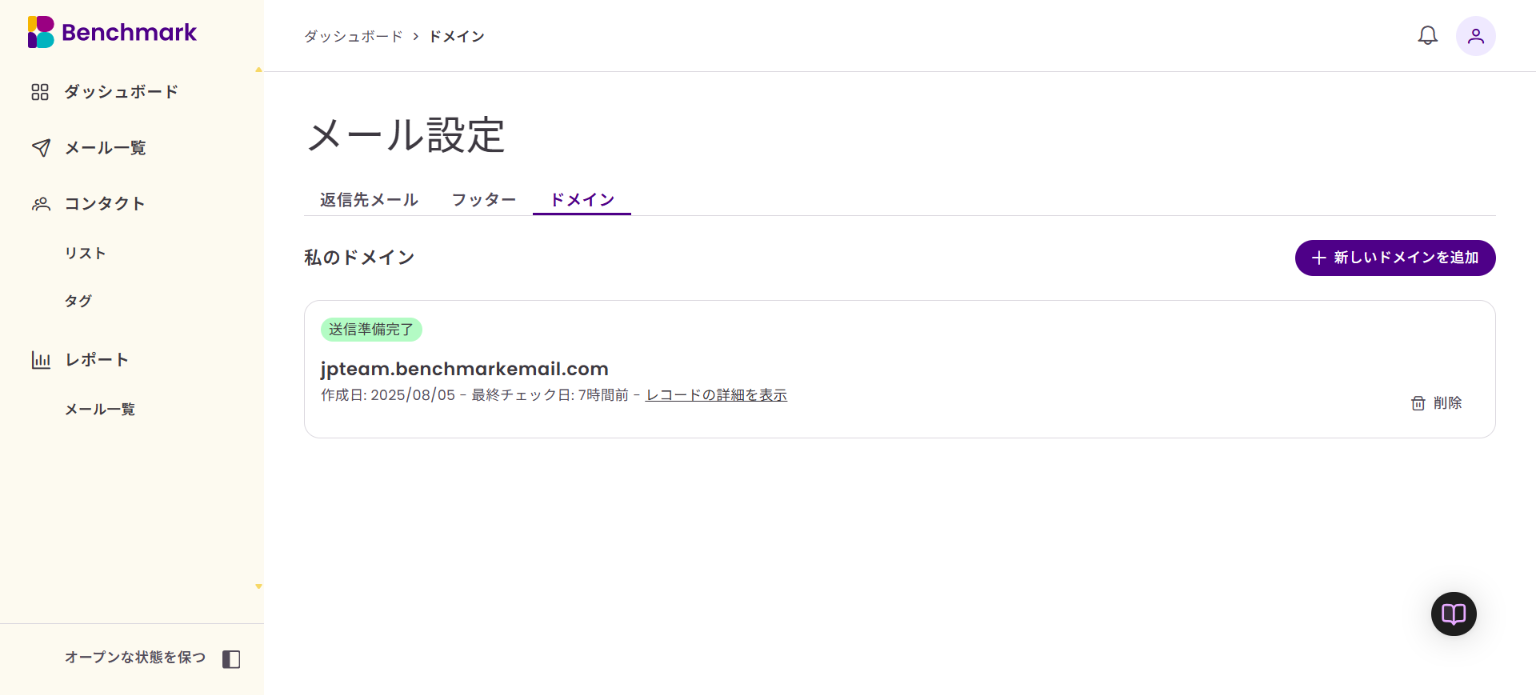 プライベートドメインを追加しても認証していない場合、メールは共有ドメインから送信されます。ドメインの状態は、[メール設定]ページの[ドメイン]タブで確認できます。