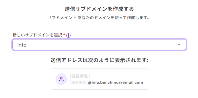 ドメイン認証ができない場合でも「共有ドメイン送信」という代替手段を提供しています。これにより業界標準の認証と規定に準拠し、メールは当社所有のドメイン(例:yourname@001a0.us.benchmarksend.com)から配信されます。