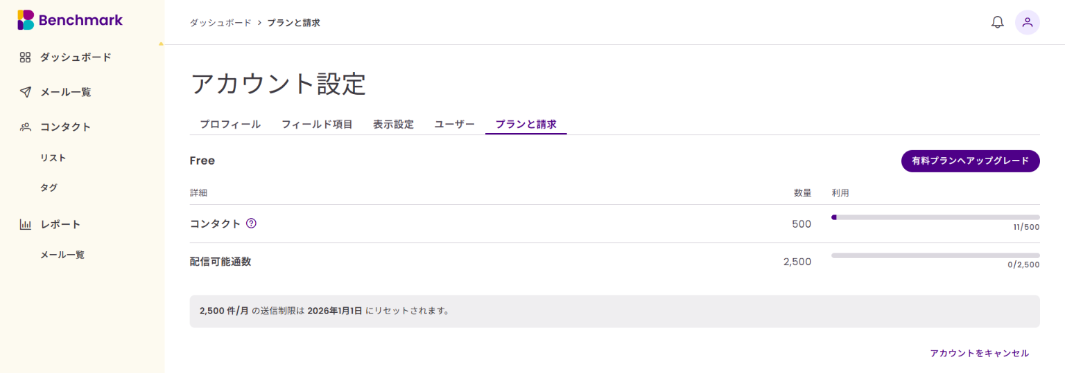 コンタクト上限や配信可能通数、ご請求サイクルなどの現在ご利用中のプランの詳細が表示されます。