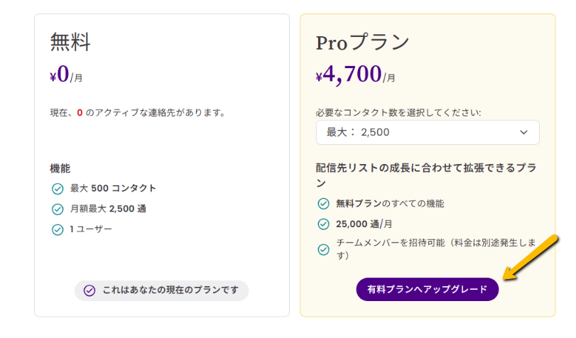 現在アカウント内に登録されているコンタクト数に応じた適切なプランが表示されており、アカウント内のコンタクト数が既に超過しているプランは選択できません。