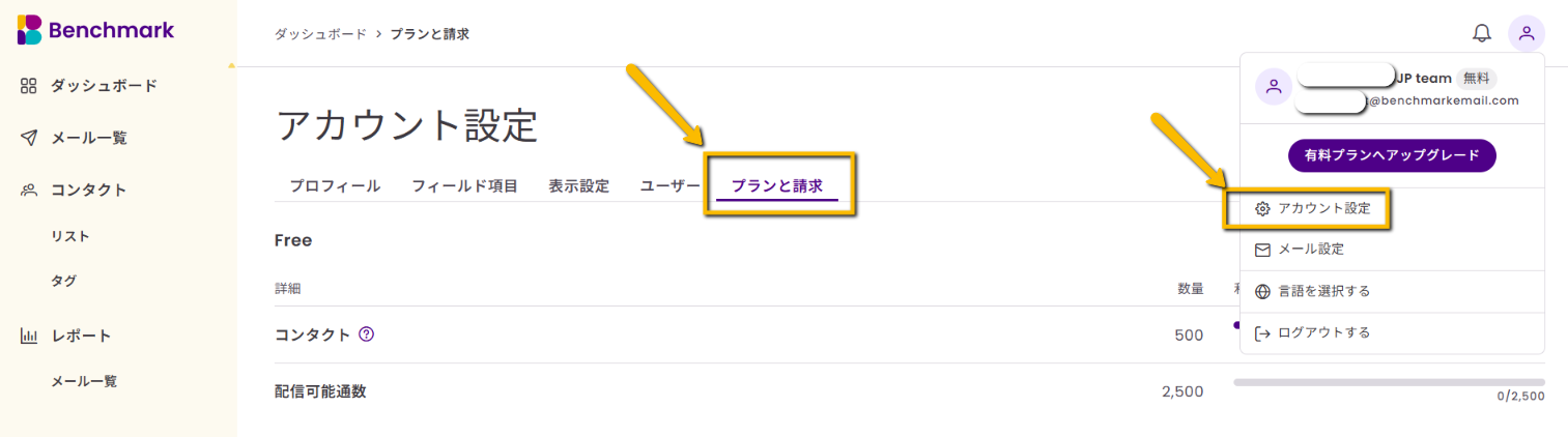 アカウントのアップグレードは、アカウントのオーナーのみが行えます。『アップグレード』または『プラン変更』のオプションが表示されない場合は、正しいアカウントにログインしているかご確認ください。