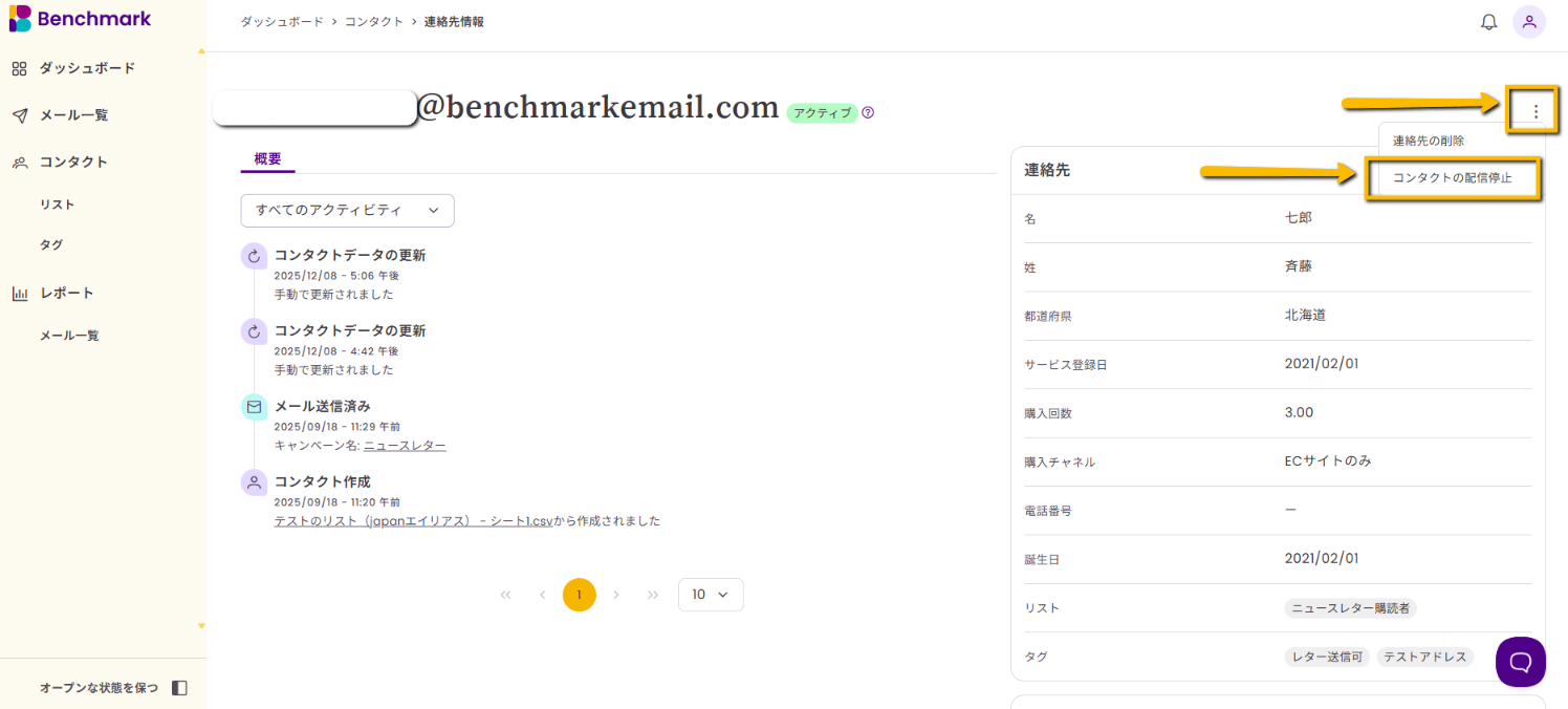 コンタクトを配信停止にするとステータスが「配信停止」に変更され、今後のメール配信対象から除外されます。