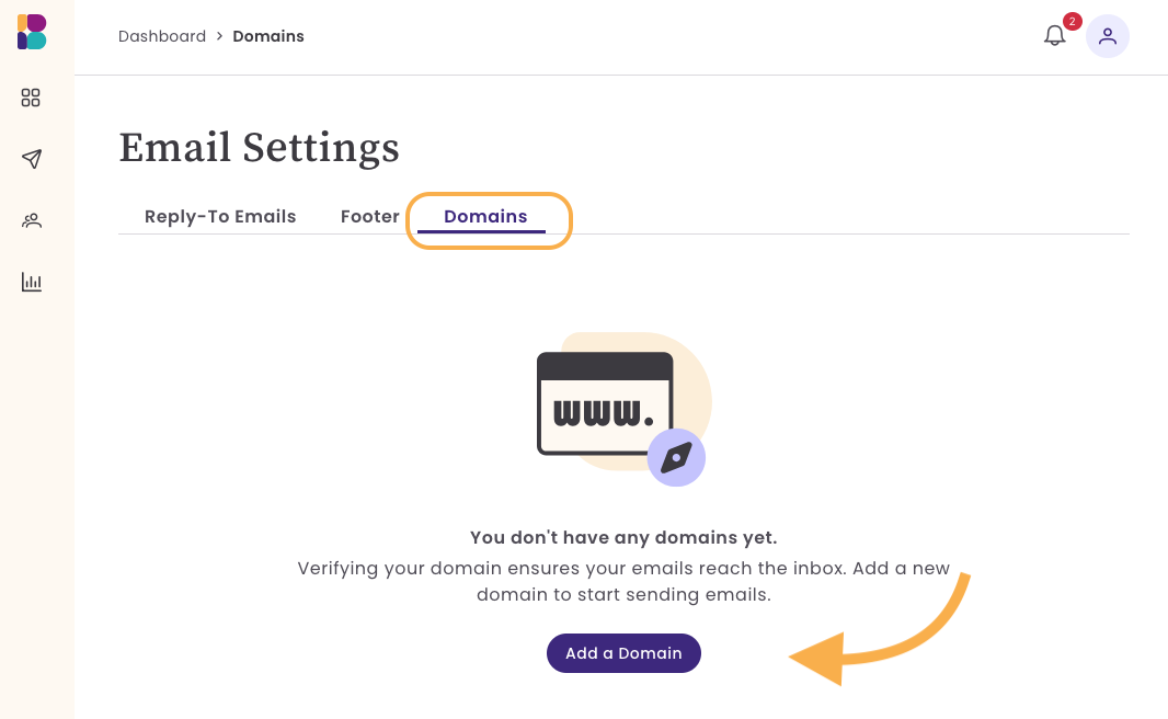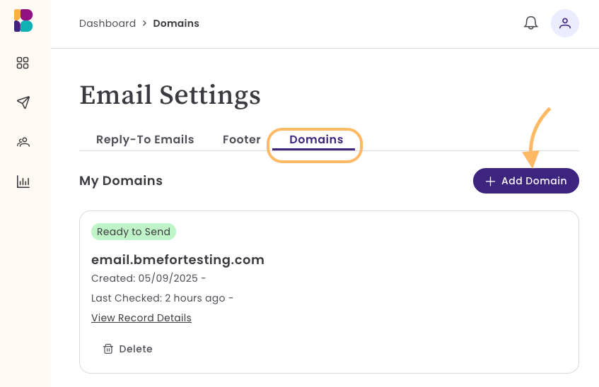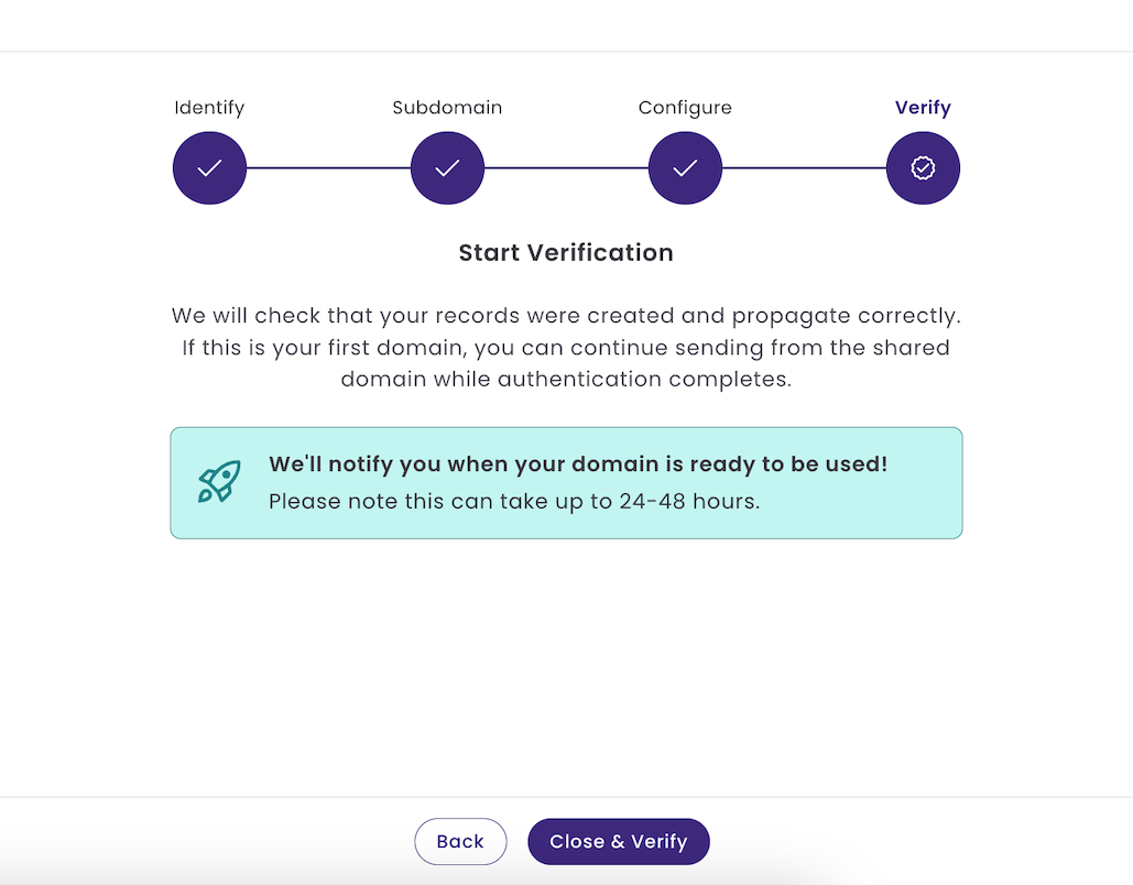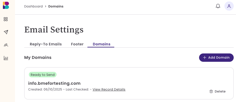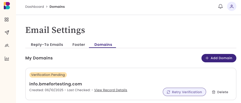 初めてのドメイン設定の場合、認証が完了するまで共有ドメインからメールを送信できます。