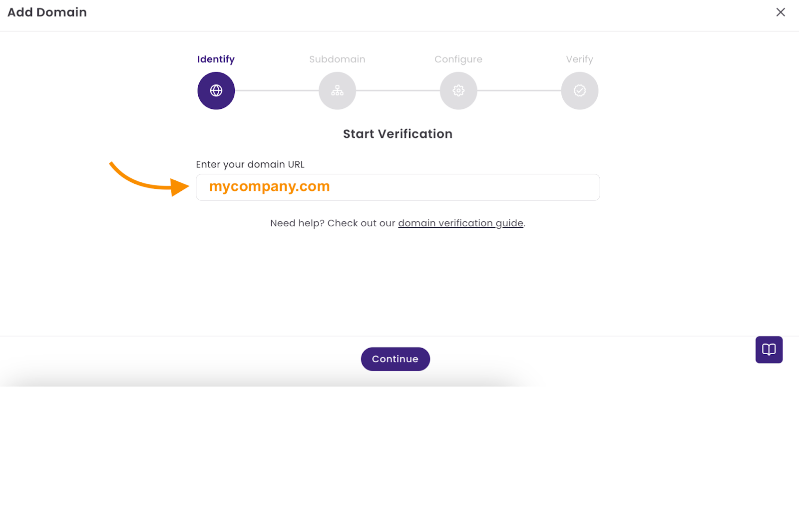 - ドメインURL (e.g., mycompany.com)を入力し、続けるをクリックします。