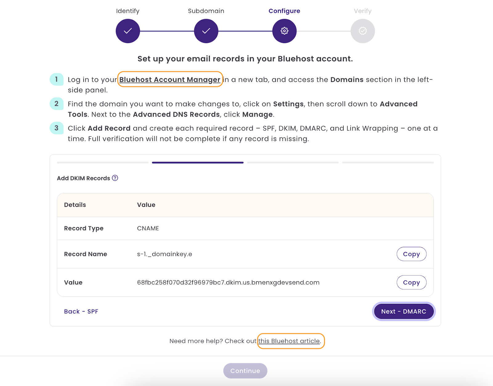 5つ全てのレコードをドメインのDNS設定に追加したら、Continue をクリックします。