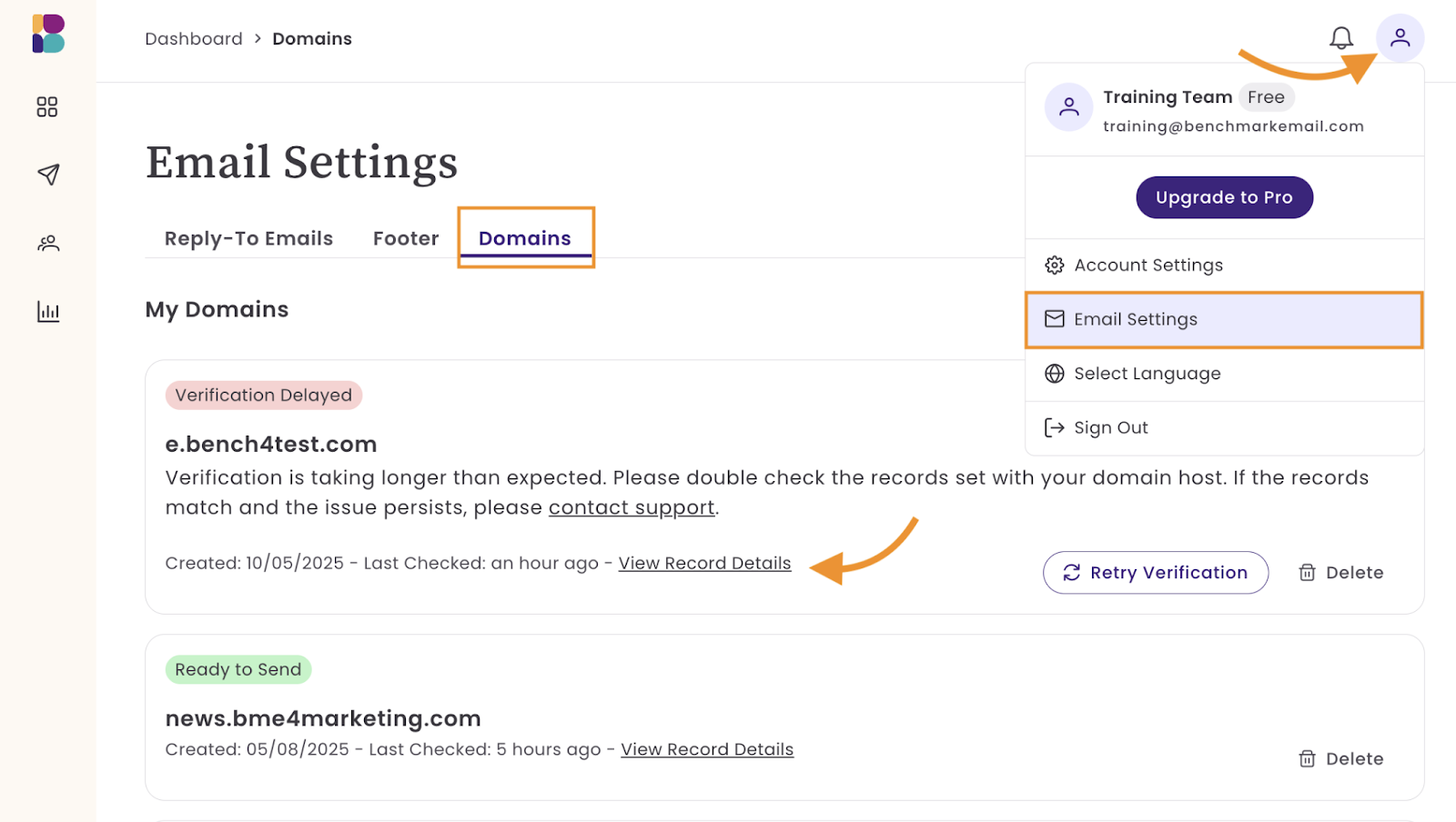 ドメインが認証されていない場合は、メールはBenchmark の共有ドメイン経由で送信されます。その際は、1ヶ月あたりに配信できるメール通数が制限されますのでご注意ください。