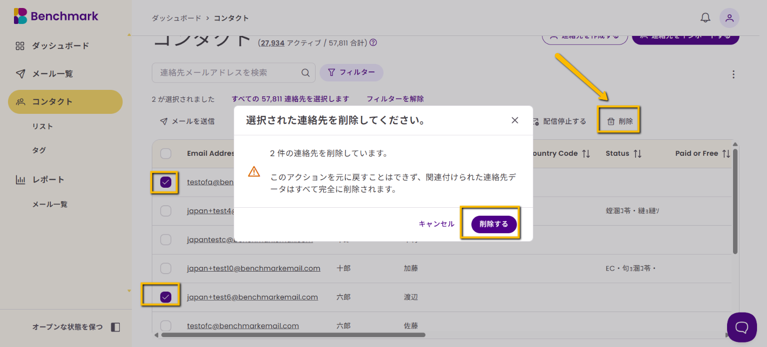 アカウントからは個別または複数のコンタクトを削除できます。また、リスト自体を削除することも可能です。ただし、リストを削除しても登録されているコンタクトは削除されません。
