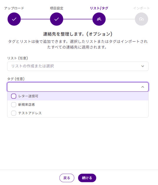 ファイルから連絡先をインポートするには、項目名(フィールド)のマッピングなどいくつかのステップが必要です。また、コンタクト登録後に、リストやタグを適用することで、連絡先を整理することができます。
