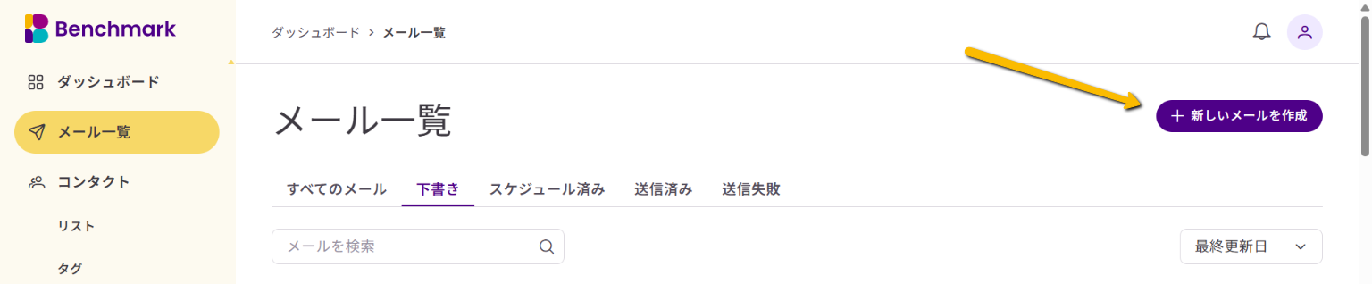 ダッシュボードから「メール」をクリックし、「新しいメールを作成」を選択します。
