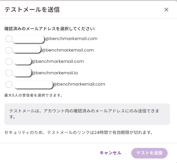 テストを送信: 受信ボックスでどのように表示されるかを確認するために、自分自身にテストメールを送信します。テストメールは一度に5通まで送信できます。セキュリティのため、テストメールのリンクは24時間で失効します。