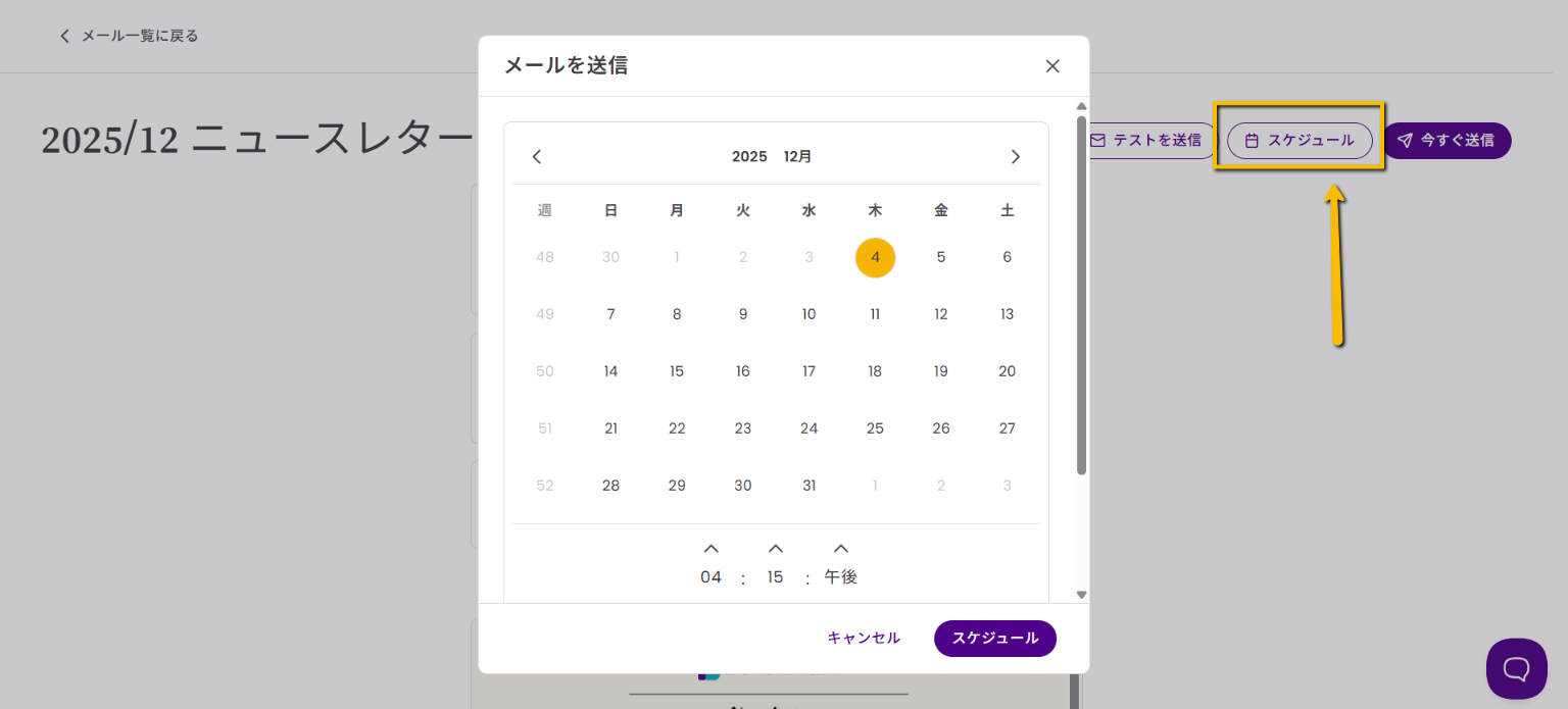 スケジュール:メールの送信日時を設定します。タイムゾーンはブラウザの設定で決まります。