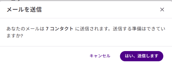 今すぐ送信:メールはすぐに送信されます(配信時間はコンタクトの数によって異なる場合があります)。メールを受信する連絡先の数が表示されます。メール送信後、配信を停止することはできません。