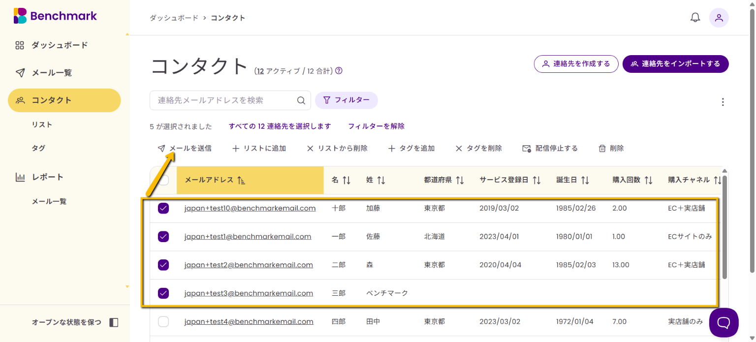 コンタクトダッシュボードから、一部のコンタクト、すべてのコンタクト、または特定の条件でコンタクトをフィルタリングしてメールを送信できます。
