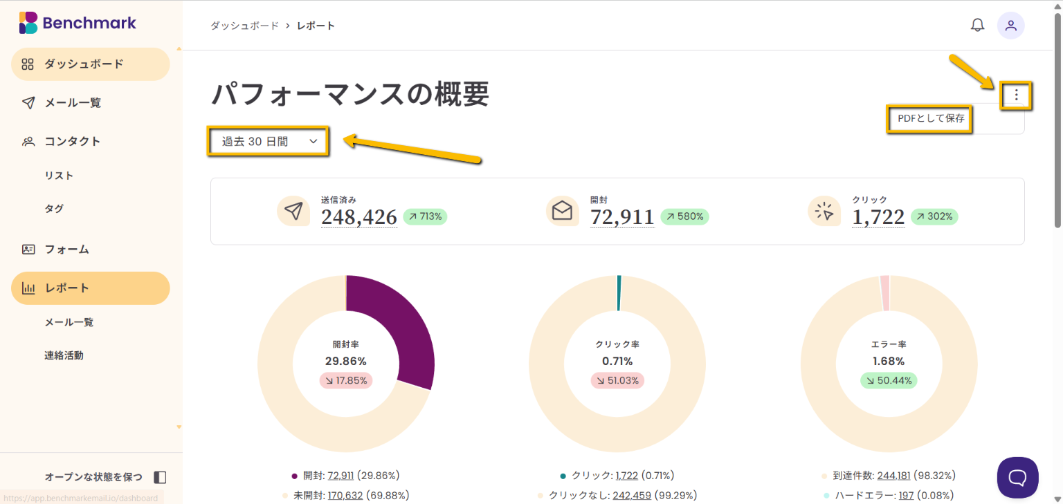 「パフォーマンスの概要」ページでは、メールパフォーマンスの包括的な結果が表示されているため、主要な指標を確認し、今後のキャンペーンを最適化するのに役立ちます。30日、60日、90日で結果を絞り込むことができます。