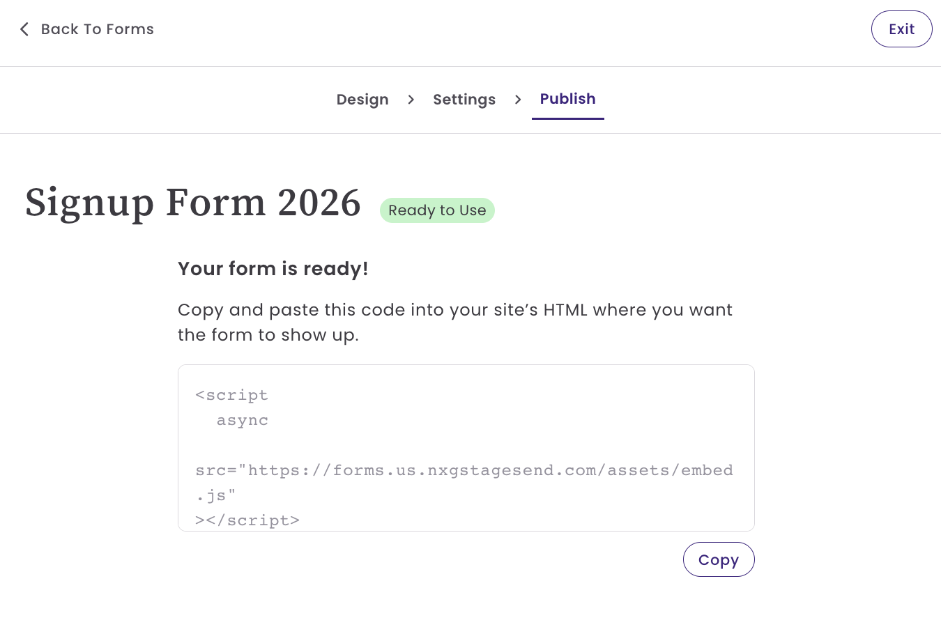 「公開」ページでは登録フォームの埋め込みコードを確認できます。
