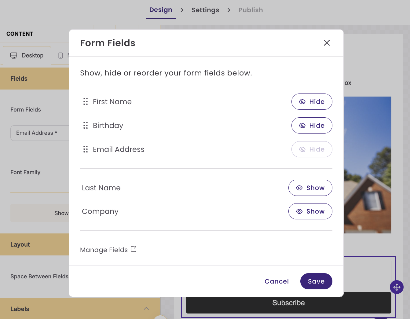 「アカウント設定 > フィールド項目」で画面が開きますので、設定後に登録フォーム画面へお戻りください。