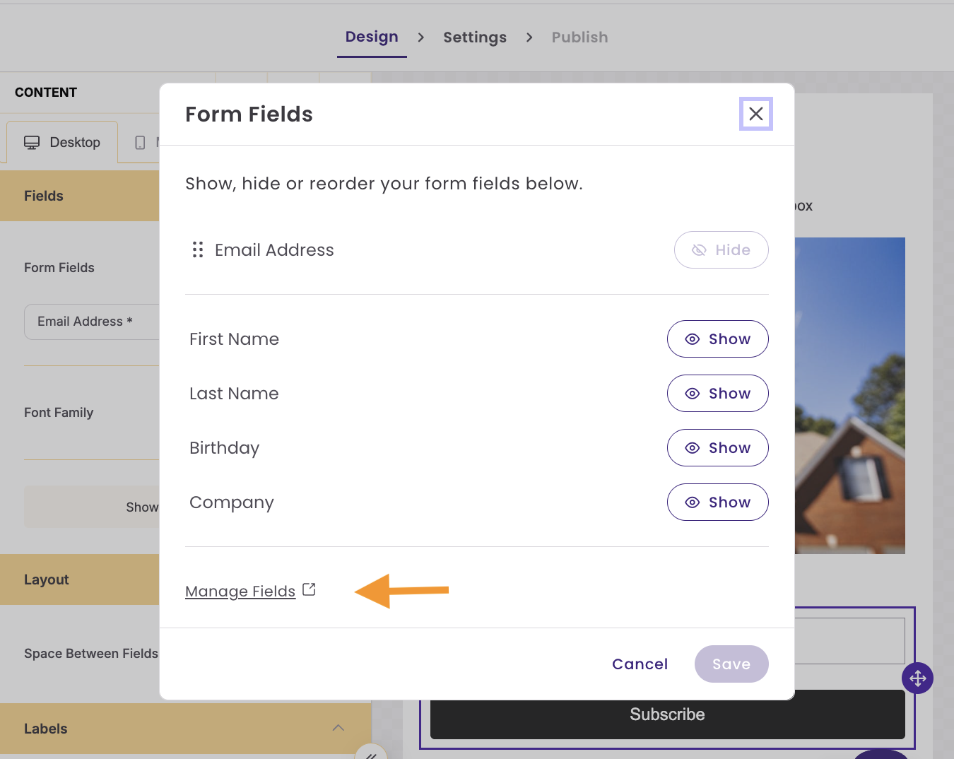 登録フォーム内の「メールアドレス」欄をクリックすると、左側に「項目」メニューが表示されます。