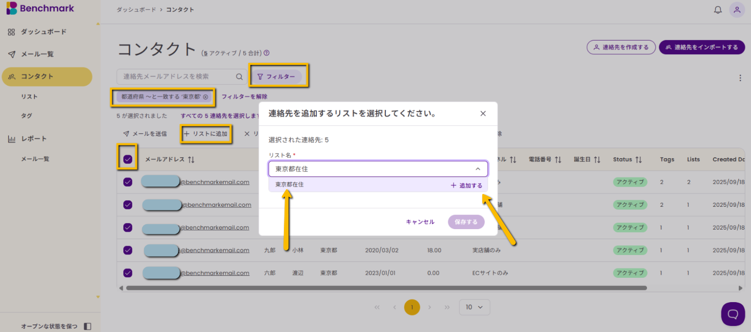 コンタクト一覧ページのフィルタ結果から、リストを作成する方法は以下の通りです。