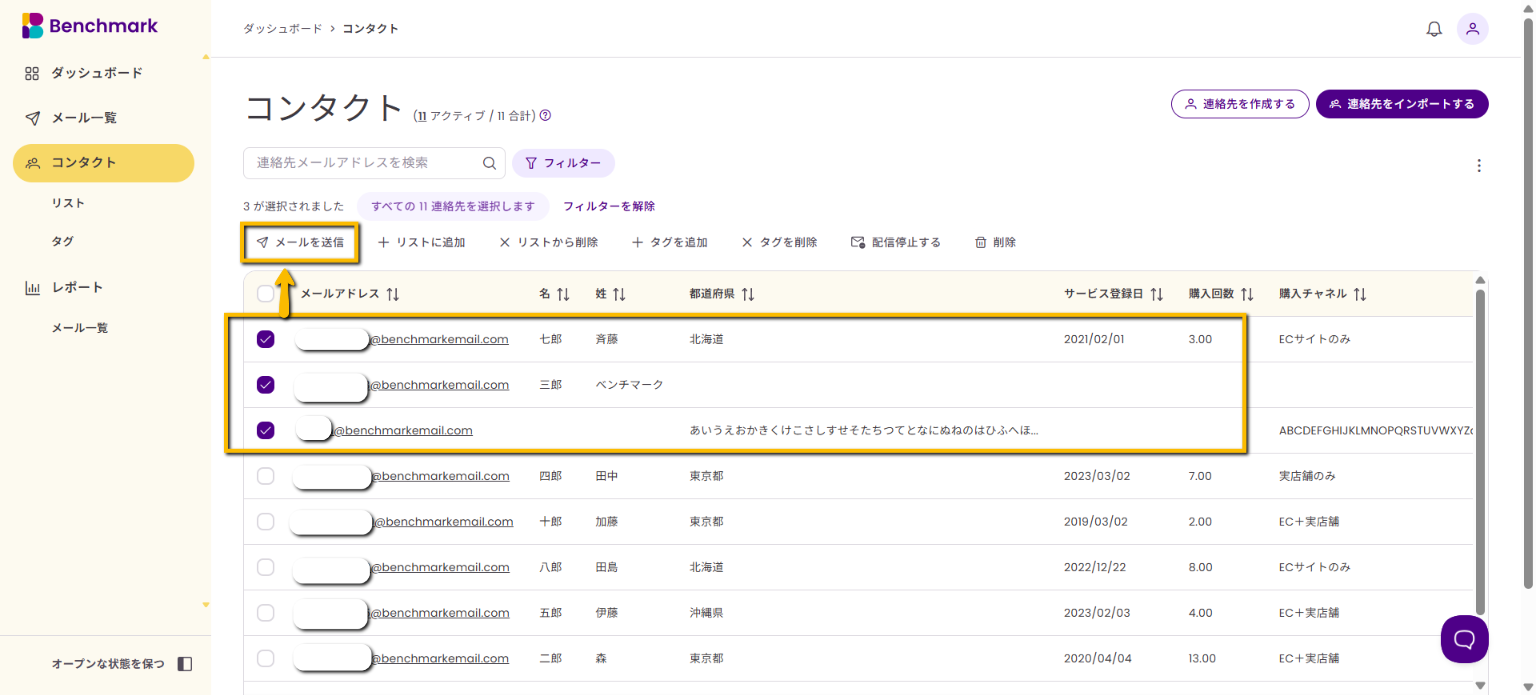 コンタクト一覧ページにて、フィルター機能等を利用してメール送信したいコンタクトを抽出します。該当コンタクトのチェックボックスをクリックし「メールを送信」を押してください。