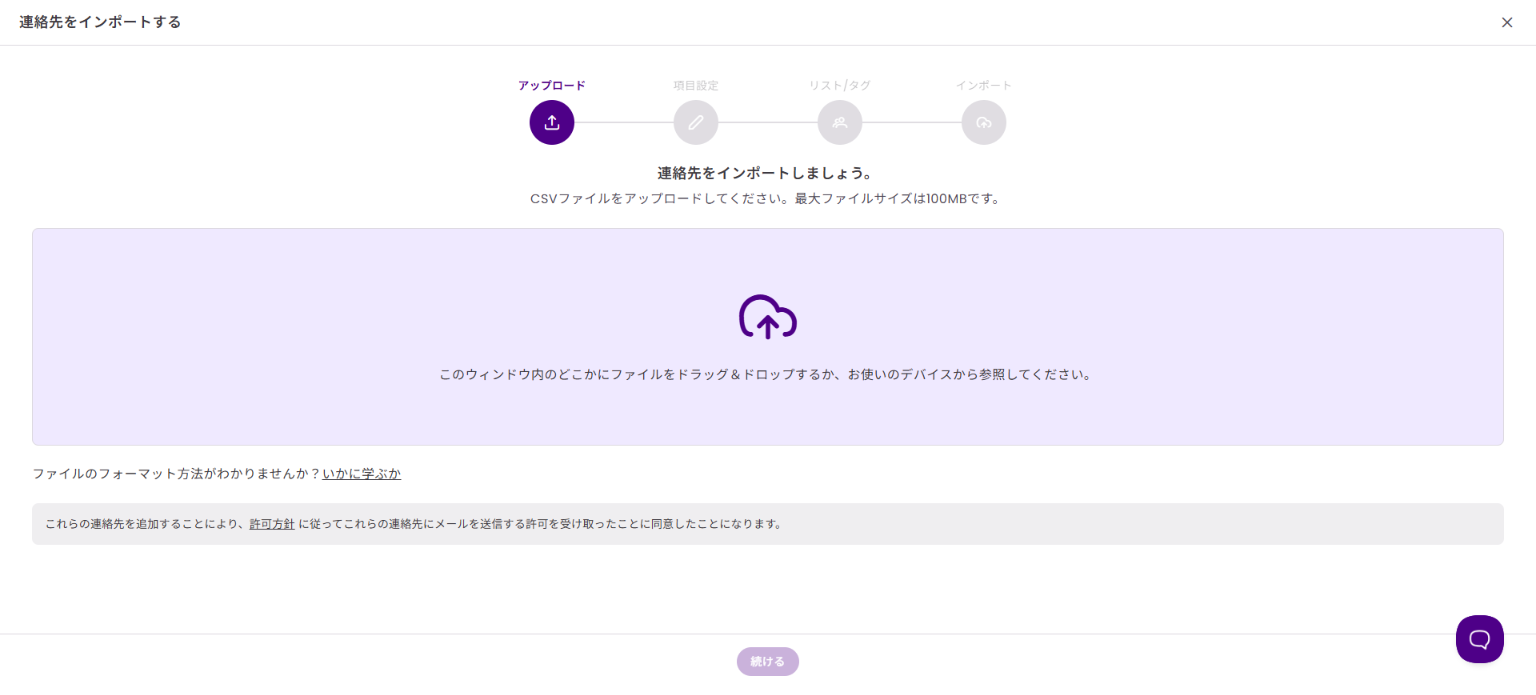 「連絡先をインポートする」 をクリックして、CSVファイルをアップロードしてください。