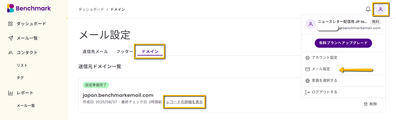 - Benchmark Emailに戻り、ドメイン認証画面でステータスを確認します。
