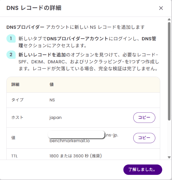 表示された情報は、ドメインのDNS設定に新しいNSレコードを追加するために使用されます。