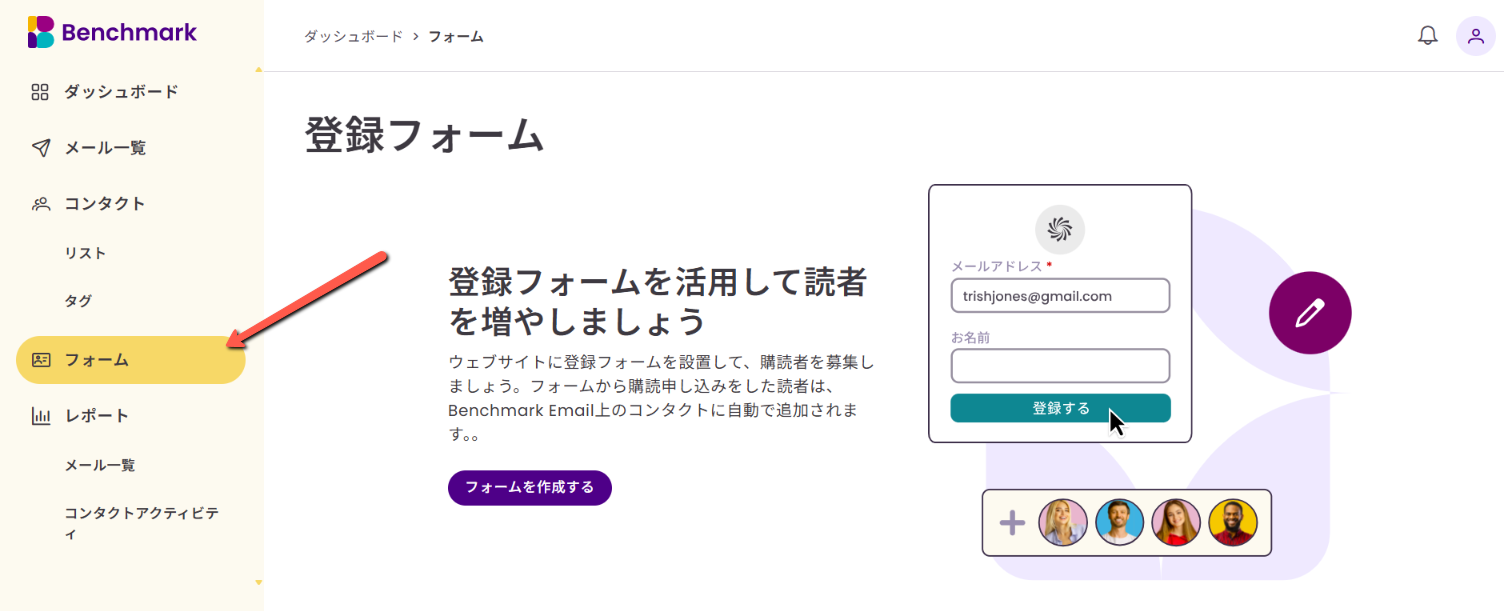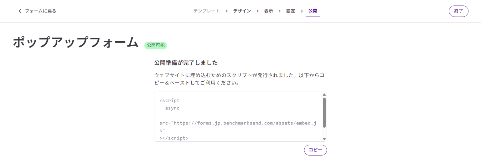 公開ページではサインアップフォームの埋め込みコードを取得できます。
