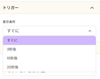 トリガー ポップアップを表示するタイミングを設定できます(例:ページ読み込み直後や、一定時間経過後など)。 |