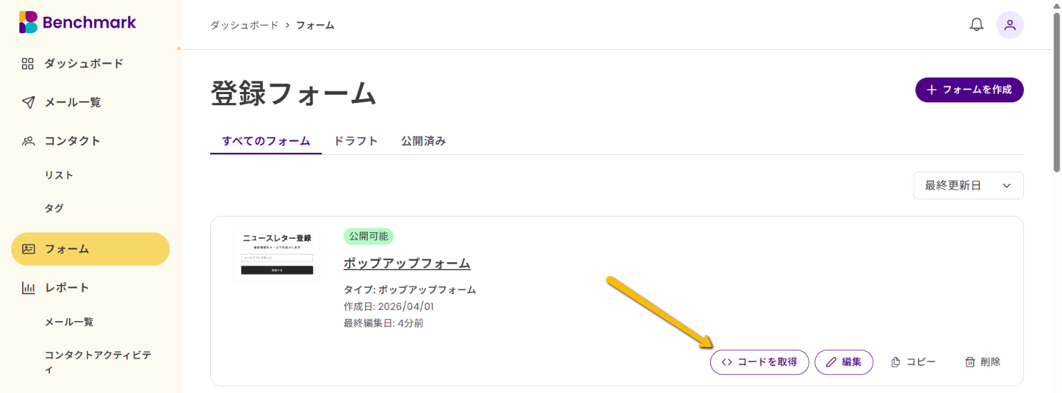 フォームページの「<>コードを取得」を選択すると、いつでも埋め込みコードを確認できます。