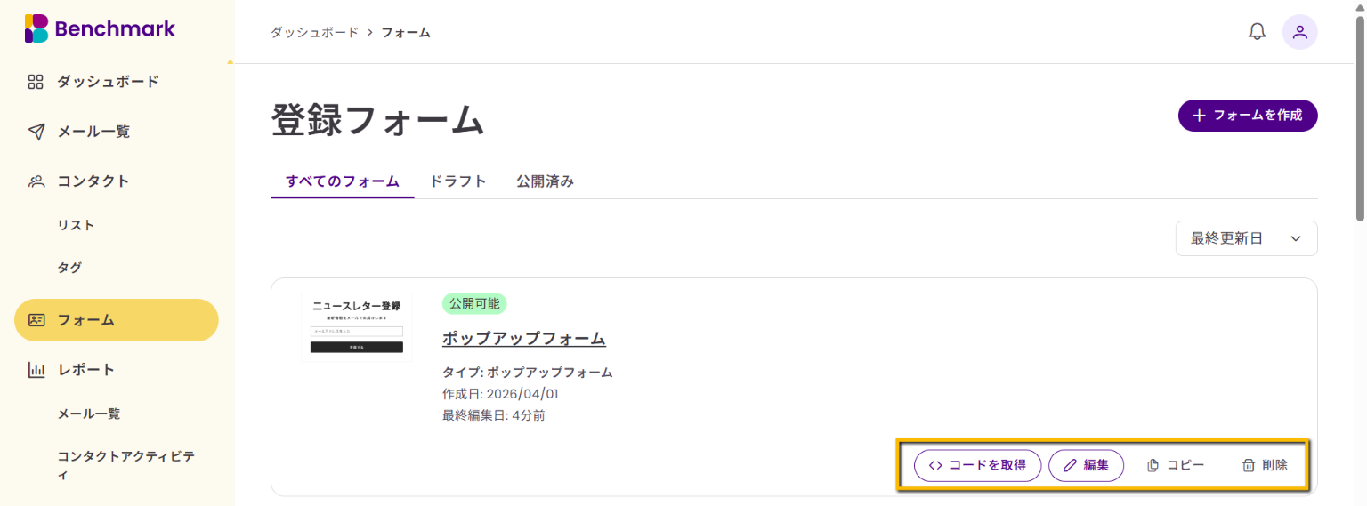 - 登録フォームのコード取得:「<>コードを取得する」にて登録フォームのコードをコピーできます。