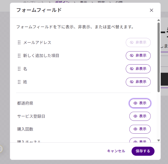 フォーム内のメールアドレス欄をクリックすると左側に「フィールド」メニューが表示されます。そこで「フィールドを編集」を選択し、追加したい項目の「表示」をクリックしてください。