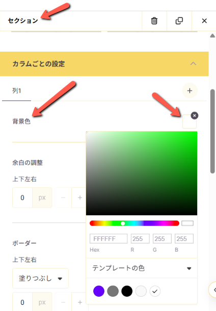 セクションのカラムごとの設定内の「背景色」をクリックして任意の色をご選択ください。