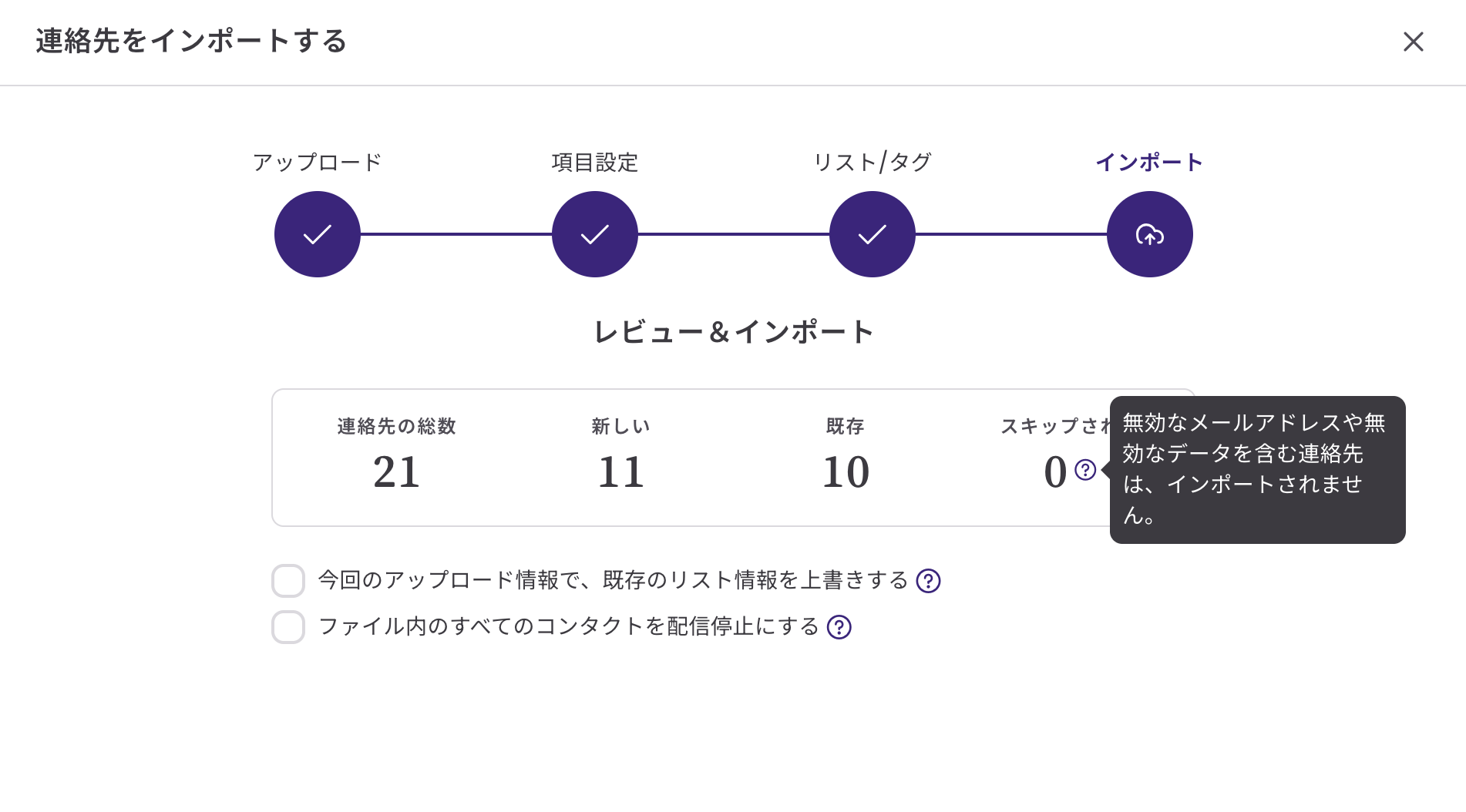 ファイルをインポートする前の最終確認画面で、「スキップされた」の欄に件数が表示されますので、ご確認ください。
