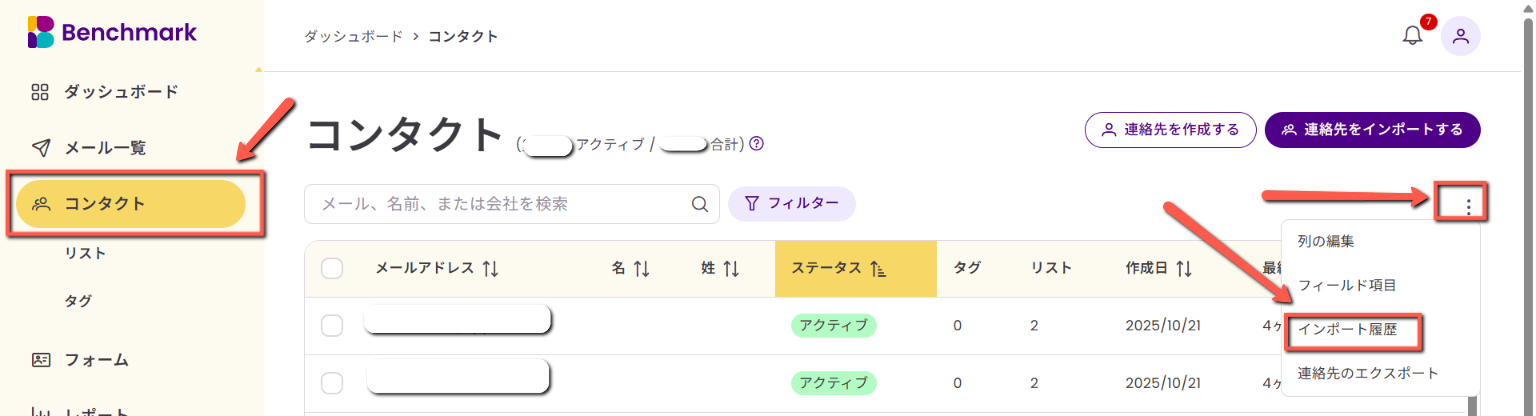 左側メニューの「コンタクト」をクリックし、右端の三点リーダーをクリックして「インポート履歴」を選択します。